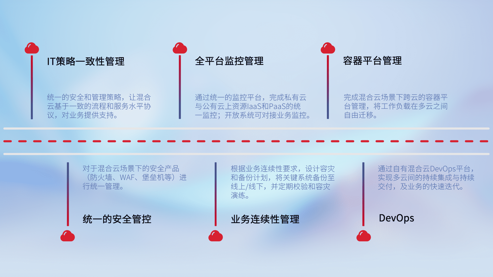 通过多云纳管,,以统一的资源数据模型把客户的云资源进行抽象和封装,,进而实现对多云资源的统一操作,,,,保障云资源管理的可靠性、、稳定性与可用性。。量身定制化运维内容,,,配置、、开发运维、、补丁管理、、备份、、、监控、、、、认证和访问管理、、、审计和日常巡检等,,保障在用云过程中的可靠度,,,,稳定度以及高可用率。。